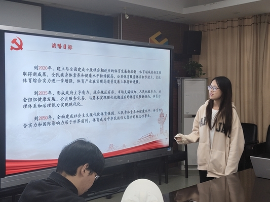 办公室俞楠同学首先介绍了建设体育强国的战略目标。我国体育强国建设分三步走:2020年已初步建立适配全面小康的体育发展新机制,实现阶段性突破;2035年将构建政府主导、社会参与、市场活跃的体育发展新格局,推进治理体系和治理能力现代化;2050 年将全面建成现代化体育强国,让我国体育实力与国际影响力居世界前列,成为民族复兴标志性事业。这一系列战略部署,既体现了国家对体育事业的高度重视,也为社会各界参与体育强国建设指明了方向。