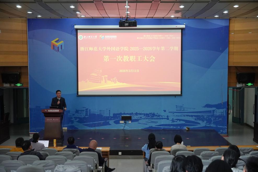 院长胡美馨通报了人事和财务相关工作并介绍了新学期重点工作安排,她表示,学院将立足外国语学院学科特色,严格对接学校整体发展部署,稳步推进“十五五”规划编制工作。在教学与学科建设工作方面,胡美馨强调,学院将积极探索AI与文科教学的深度融合,着力推动教学模式创新,切实提升人才培养质量。本学期,学院同步推进学科评估工作、翻译专业博士点申报工作、区域国别学本科专业建设工作,以新专业申报优化专业布局,构建跨学科融合育人体系,持续夯实学科基础,稳步推动外语类学科建设高质量发展。此外,学院将做好学校70周年校庆相关工作。以校庆为契机,凝聚全院共识、展示学院办学成果,扎实推动学院各项事业提质增效、稳步前行。