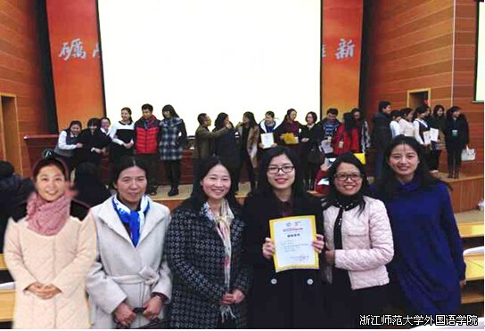 我院英语试验113班陈怡珂同学于2014年12月13日作为浙江师范大学外语组唯一选手参加了由全国地方高等师范院校教务处长联席会主办、浙江师范大学承办的第二届全国师范院校师范生教学技能竞赛,并荣获一等奖。本届比赛外语组由来自全国各师范院校53名选手参加,比赛项目包括教学设计、课件制作、即兴讲演和模拟上课四个环节。陈怡珂同学在各个比赛项目中表现优秀,最终荣获一等奖。