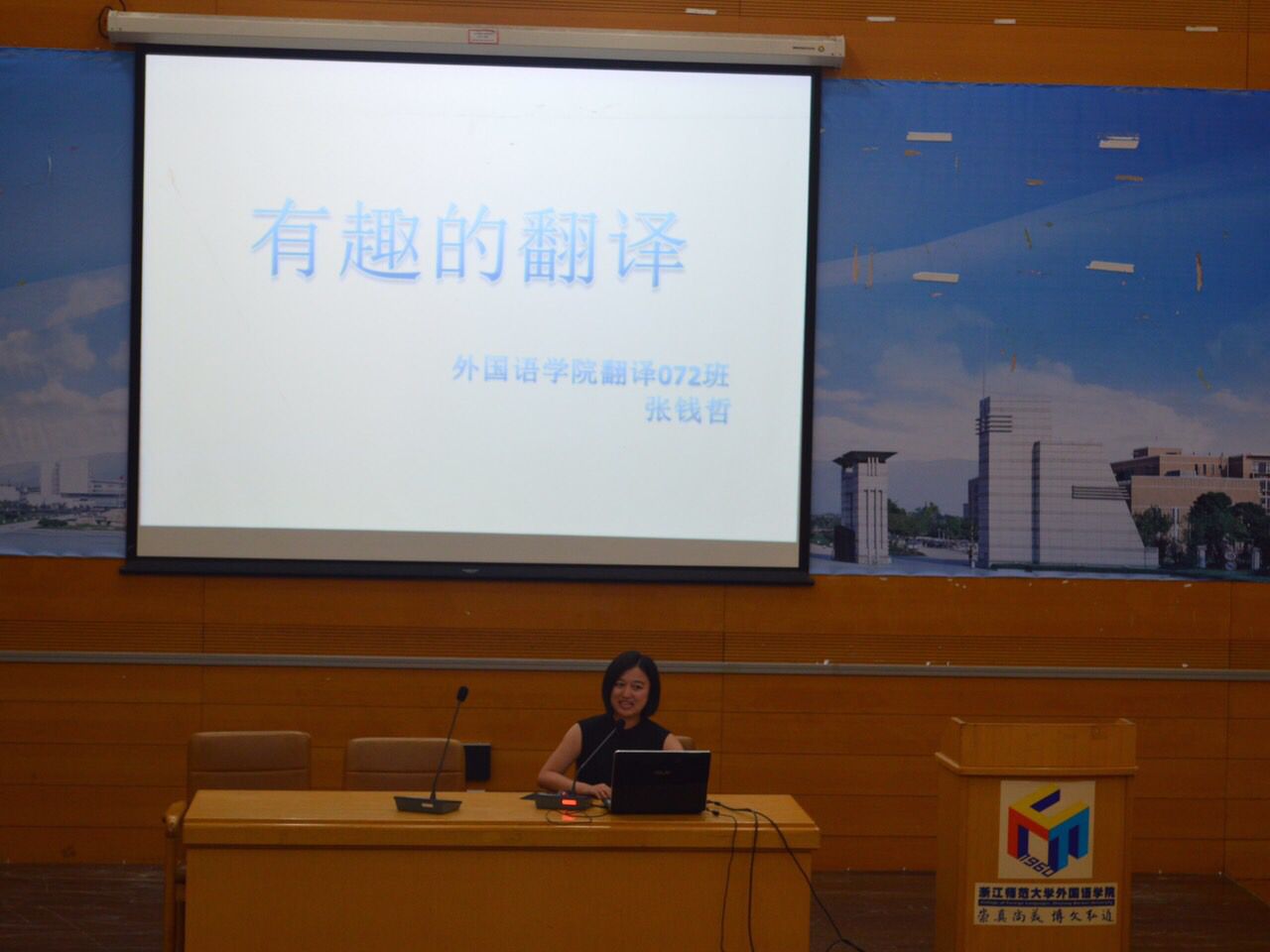 2007年入学、2011年毕业的张钱哲可以说是翻译系的“大师姐”,后考入上海外国语大学高级翻译学院攻读口译硕士,毕业后就职于上海文化贸易语言服务基地,是一名项目经理,同时也参与口笔译的培训工作。翻译和旅游在她看来都是很有趣的事情,“因为你永远都不知道下一秒会发生什么,总有惊喜在等着你。而我们首先需要做的,是去相信我们所做的事情是有趣的,才能把它做好。”大师姐笑着讲述她选择这个职业的原因。