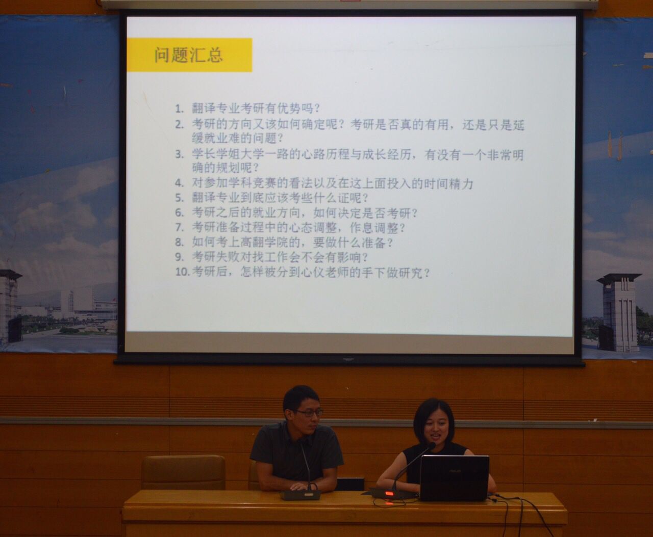 最后,在备考心态方面,张钱哲告诉大家要保持一个平稳的心态,切忌受身边同学的影响,对考研摇摆不定,意志不坚。“不要害怕失败,即便失败,机会也还是会有的,这个准备的过程并不是白白浪费,这本身就是知识的积累。”郑江锋也与大家分享了他的考研座右铭,以此激励翻译系的学弟学妹:我不去想是否能够成功,既然选择了就只顾风雨兼程!