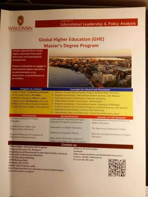 最后,作为威大教育学院全球高等教育(Global Higher Education,简称GHE)硕士学位专业项目的学术主任,李教授还顺便向大家介绍了由他负责的硕士学位课程。该项目没有国内专业要求,本科绩点3.25即可,只需12个月或16个月就能拿到硕士学位,就业率100%,考博成功率100%。雅思7.0(口语单项至少7.0),网考托福92分,学费12635美元一个学期,三个学期共计人民币26万元左右。毕业去向是高校国际项目管理。据了解,浙江师范大学外国语学院在2016年与该项目已签订合作协议,成功推荐了优秀学生入学,今后还将继续推荐更多优秀的中国学子去威大学习深造。