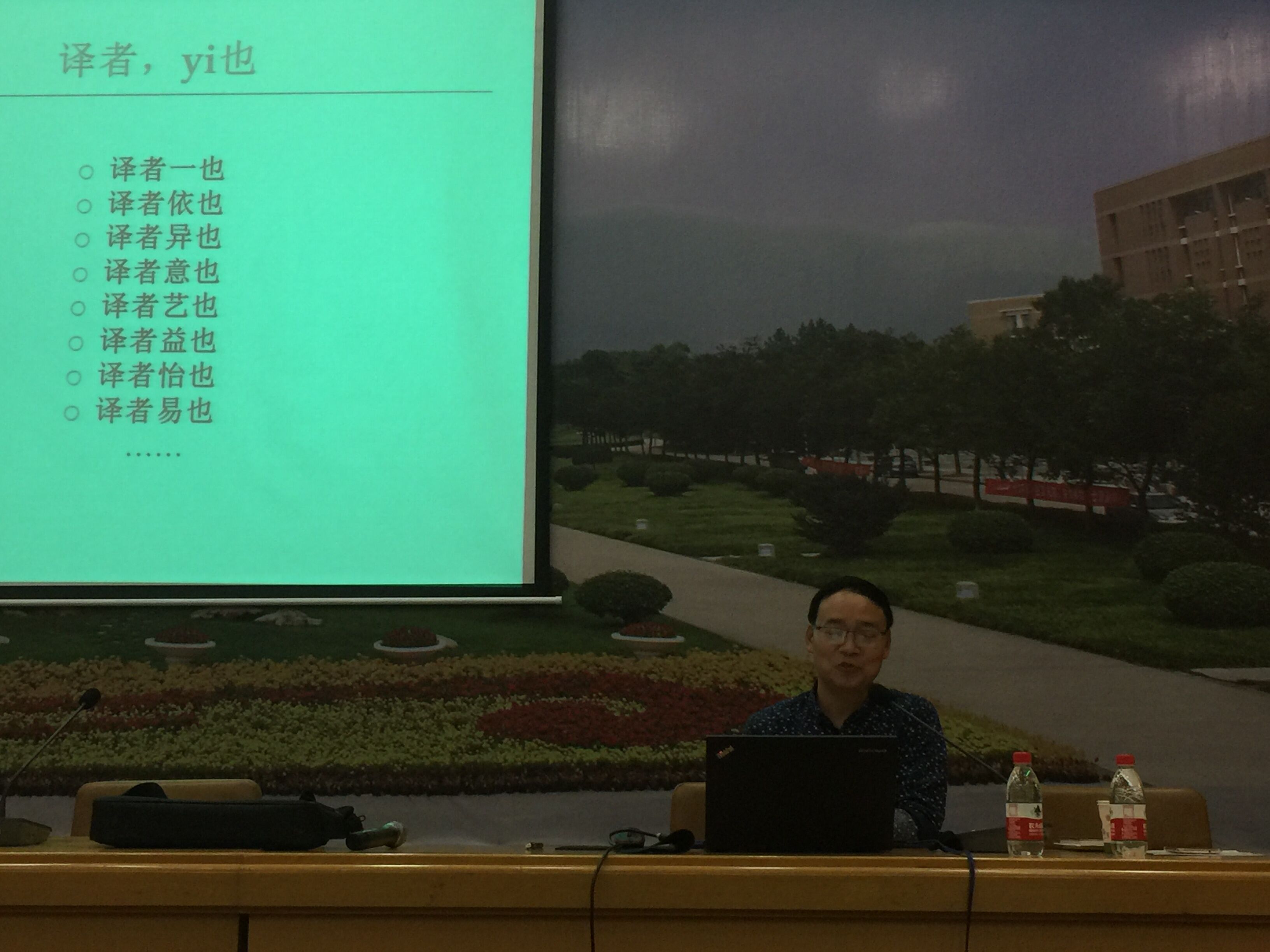 首先杨教授以熟悉的师大场景、人和事巧妙而风趣地引入话题,以翻译的定义入手,谈到了翻译即“一”“依”“易”“异”“意”“艺”“益”“怡”,用简单的同音汉字全面地阐释了翻译的功能、性质、乃至译者的技能水平和职业操守。