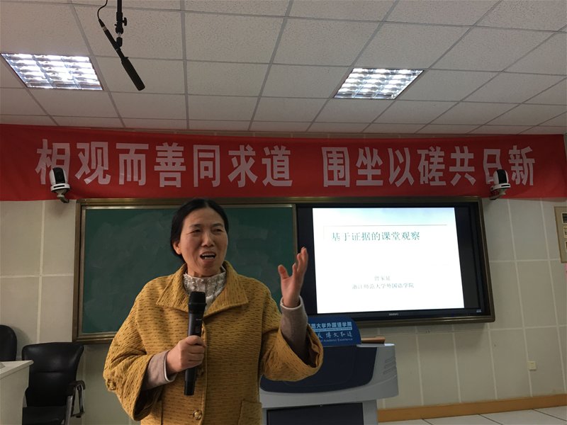 郑志恋老师做了题为《“教、学、评”一致性——基于证据的专业课堂观察》的讲座。郑老师首先提出了传统课堂观察和评价的误区,指出其缺乏研究、缺乏证据、缺乏科学性等硬伤,接着详细阐述了以学生为中心的“教、学、评”一致性的理论体系,提出了基于证据的课堂观察的具体方案,包括如何确立观察点、如何进行观察、如何记录、如何课后总结和评价等。郑老师基于自己多年的基础英语教学研究的丰富经验和成果,对每一个环节都用了形象生动的真实教学案例进行了阐述,由表及里,由现象至理论,既充分接中小学地气,又高屋建瓴,让在座的师生受益匪浅。此外,郑老师分享了她多次培养指导学生获得师范技能大赛省赛、国赛一等奖的经验探索,引起大家的热烈探讨和高度评价!