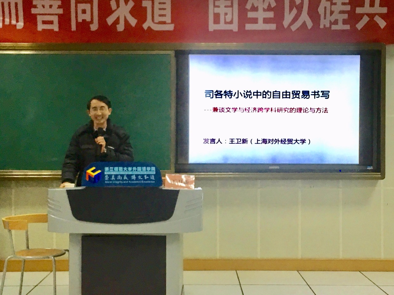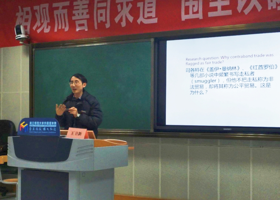 12月15日下午,北山问道第64讲在22幢301教室举行。上海对外贸易大学王卫新教授做了题为“司各特小说中的自由贸易书写”的学术讲座。讲座由我院黎会华教授主持,院长洪明等部分教师及研究生聆听了讲座。