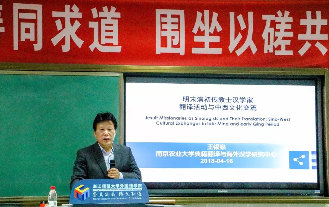 4月16日下午2:30,北山问道第68讲在22幢301教室准时开讲,南京农业大学典籍翻译与海外汉学研究中心创始主任暨首席专家、南京农业大学外国语学院王银泉教授给外国语学院师生带来了一场题为“明末清初传教士汉学家翻译活动与中西文化交流”的精彩学术讲座。讲座由翻译系主任李建军老师主持,洪明院长,俞明祥书记,翻译系、英语系、日语系、法语系、大外部的教师,研究生以及部分本科生参加了本次讲座。我院退休教师陈昌义教授也闻讯前来。讲座现场济济一堂,气氛活跃而融洽。