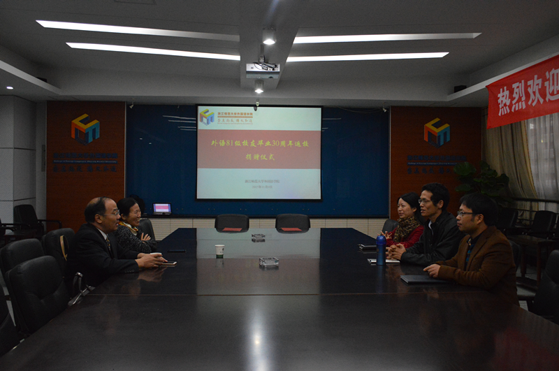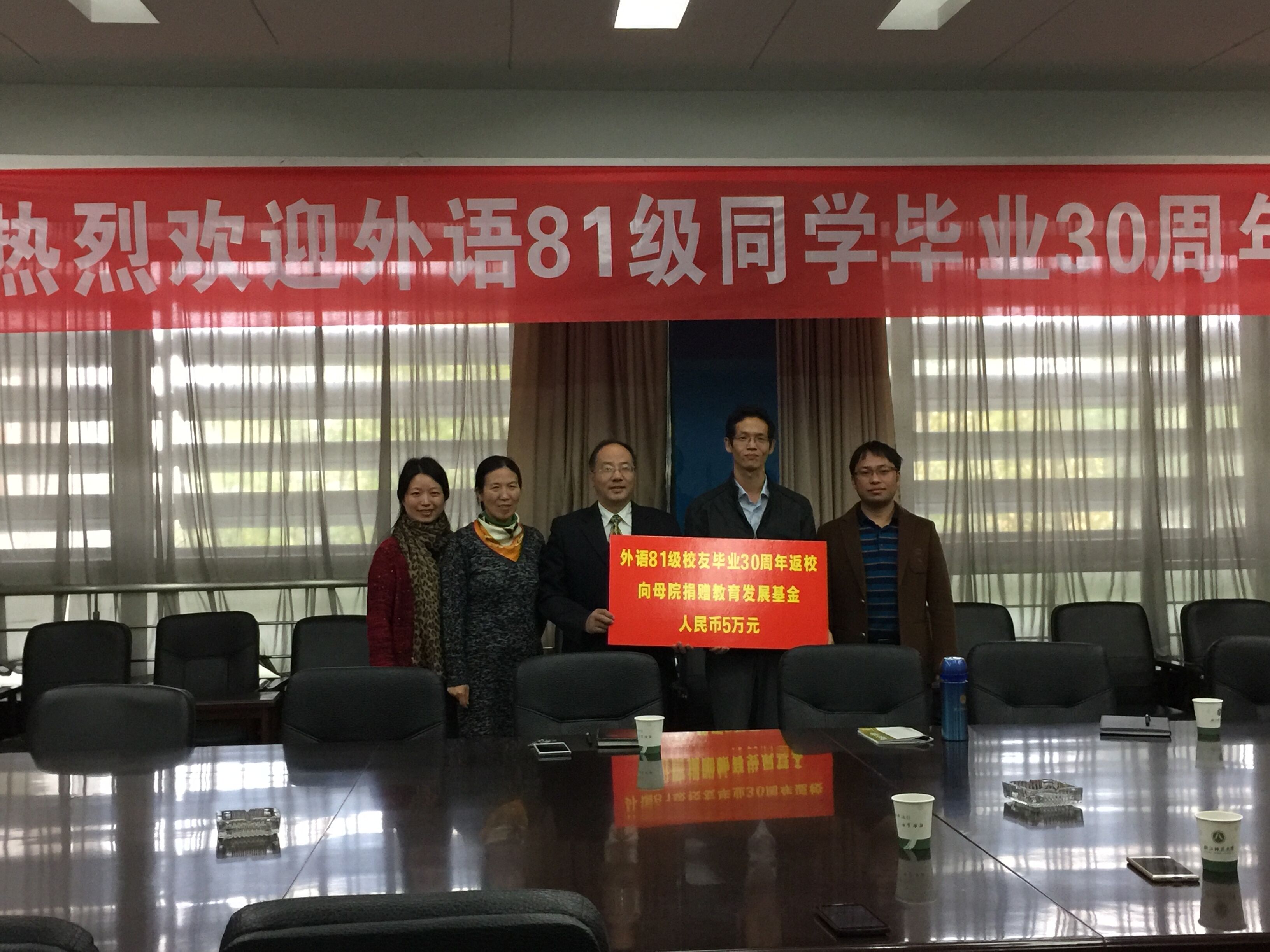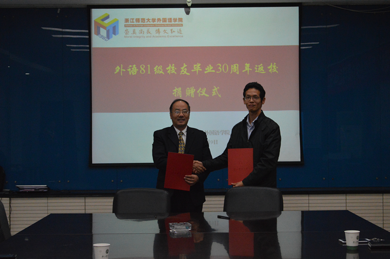 2015年11月9日,外语系81级校友毕业30周年返校捐赠仪式在学院一楼连廊会议室举行,81级校友共同捐赠5万人民币,用于支持学院的改革与发展。81级校友代表、金华检验检疫局副局长骆正龙,81级校友代表、毕业后留校工作的教师郑志恋,学院党委书记俞明祥、副书记林凌斌、副院长胡美馨出席了签约仪式。仪式由俞明祥书记主持。