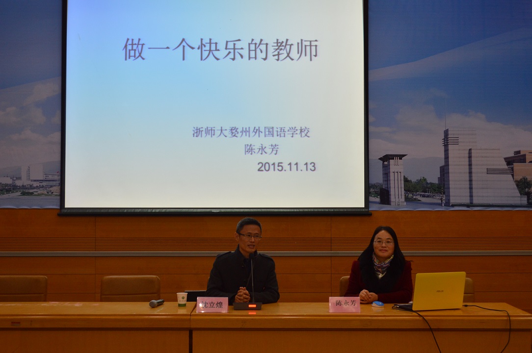 11月13日晚,外语88届院友、金华市婺州外国语学校副校长、特级教师陈永芳老师应邀回学院给在校学生做讲座。讲座题目“做一个快乐的英语教师”,由学工办主任沈立煌主持讲座。