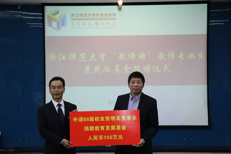 2016年4月16日上午,我校英语88届校友、北京大视野教育控股有限公司董事长张明高先生为我校“教师网”教师专业发展奖励基金会捐赠100万元,向母校60华诞献礼。浙江师范大学副校长李伟健出席捐赠仪式并讲话,外国语学院全体班子成员、北京大视野教育集团的有关人员共同参加捐赠仪式。仪式由外国语学院党委书记俞明祥主持。