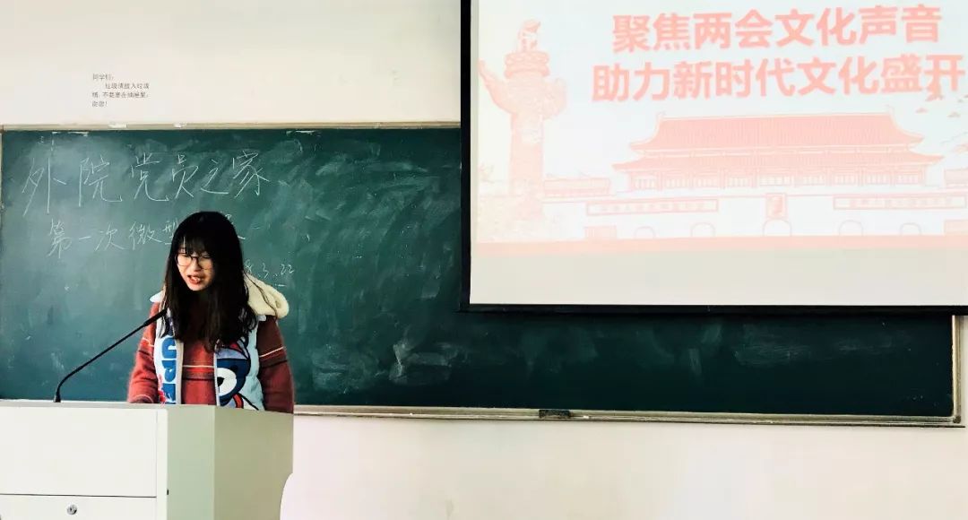 3月22日中午,我院第41次“两学一做”学生微型党课于22幢102教室开讲。来自研究生外国语言文学党支部的戴瑶瑶同学带来以“聚焦两会热点,品味文化担当”为主题的微型党课。院党委副书记林凌斌与各支部学生党员共同聆听了本次党课。