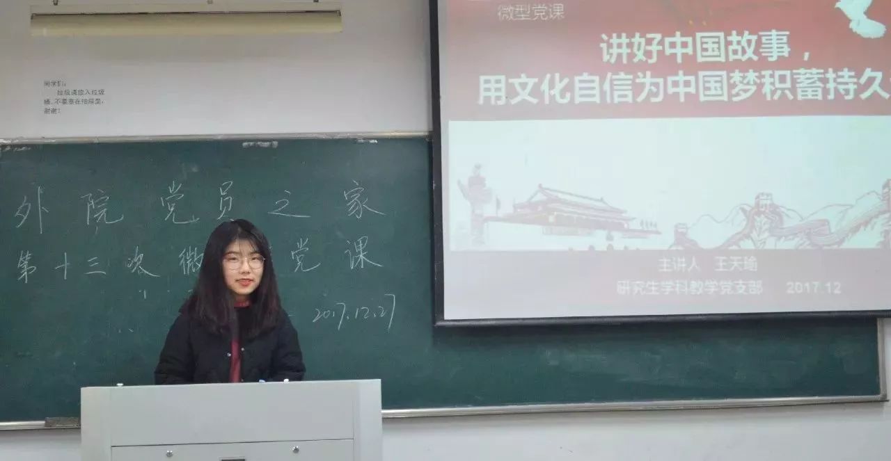 12月27日中午,我院第三十九次“两学一做”学生微型党课于22幢105教室开讲。来自研究生学科教学党支部的王天瑜同学向大家展示主题为“讲好中国故事,用文化自信为中国梦积蓄持久动力”的微型党课。