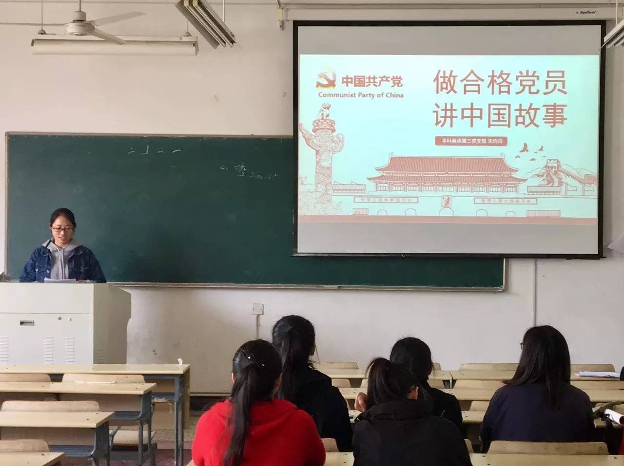 4月12日中午,我院第十九次“两学一做”学生微型党课在23幢108教室顺利开展。来自本科生英语第三党支部的朱玲霞同志为大家带来以“做合格党员,讲中国故事”为主题的微型党课。