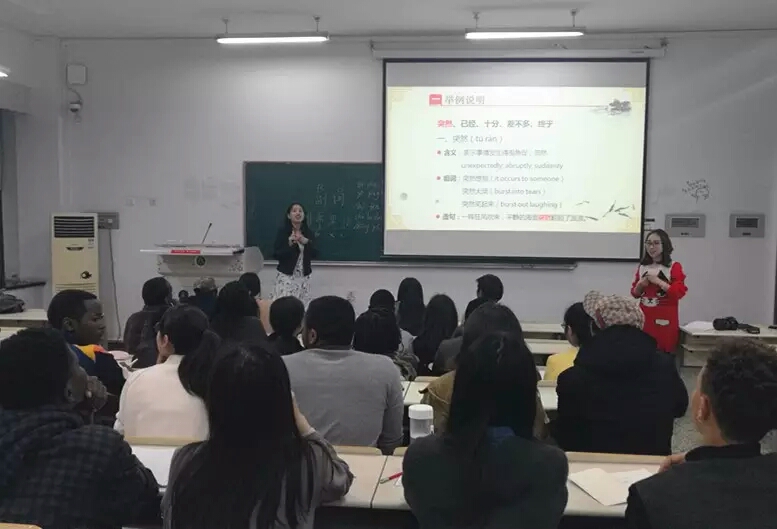 在第一环节,何蕾同志向留学生介绍了副词的含义,并举例让大家判断对错。紧接着,她逐一详细解释了突然、已经、十分、差不多、终于等副词的具体意思和用法,并用英语词组帮助留学生更好理解。她还特别邀请留学生同学根据自己的理解用身体语言来演绎突然哭了(burst into tears)等语句,留学生同学的精彩表演惹得大家拍手称赞,笑声连连,也加深大家对所学词义的理解和记忆。