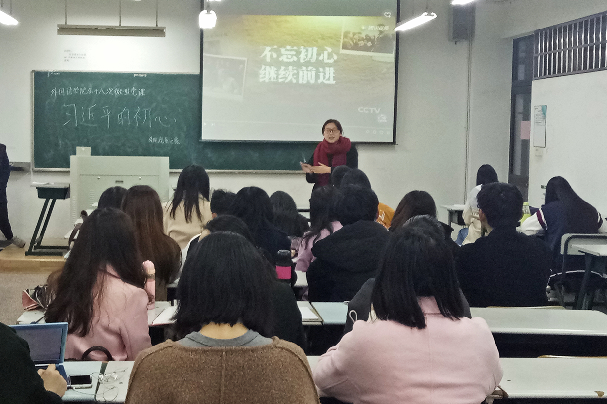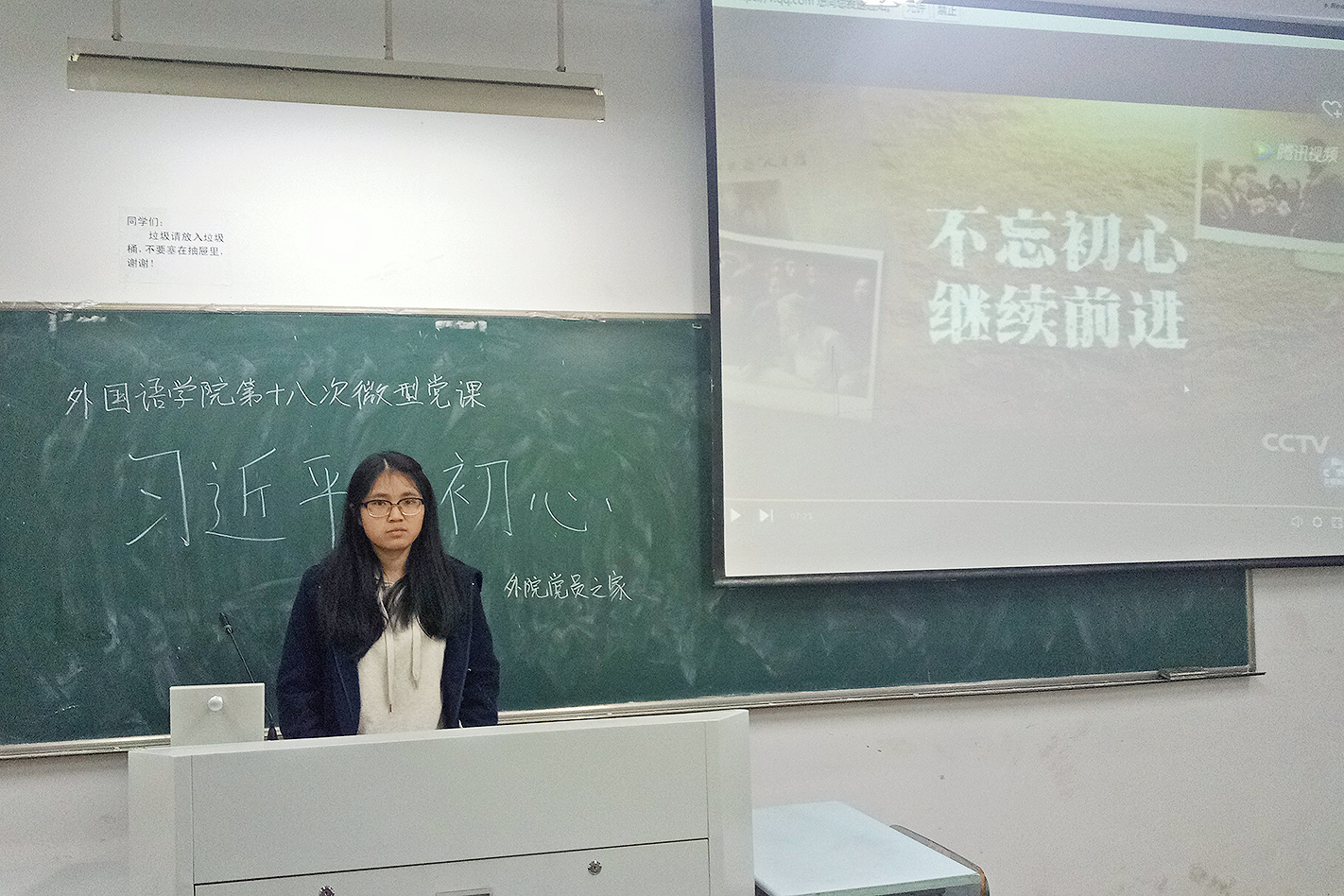 最后,学工办辅导员陈盼老师总结发言:在观看完《初心》系列微视频后,各个党支部都有自己独特的见解,同时鼓励大家学习习近平总书记,做到“心中有信仰,脚下有力量”,在日常学习、生活和工作中对自己提出更高的要求,希望同学们怀揣一颗美好的初心走进外国语学院,今后走出校园时仍怀着那一颗初心。