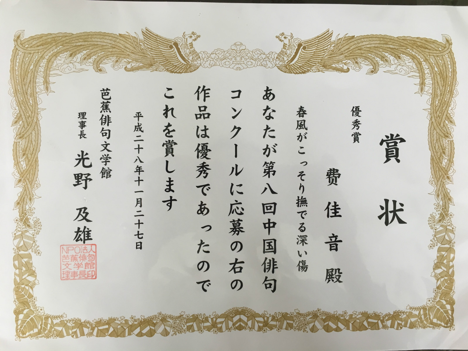 2017年6月26日,我系2013级费佳音同学收到了第八回中国俳句大赛优秀奖的获奖通知及奖状。中国俳句大赛是日本NPO法人芭蕉俳句文学馆主办、面向中国日语学习者的俳句创作大赛。2016年,费佳音同学在外教薮博史老师的指导下参加了本次比赛,参赛作品“春風が こっそり撫でる 深い傷(春风暗拂深伤)”从数千首俳句中脱颖而出,获得优秀奖。由于对作品原创性进行了严格的审核,组委会在赛事结束半年后才寄出奖状。