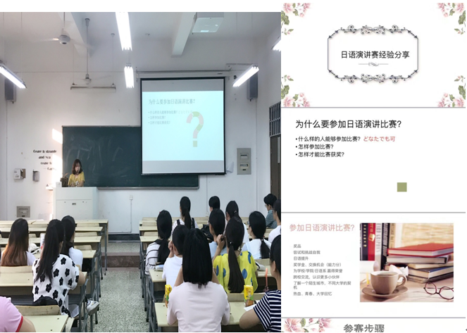 为提高学科竞赛水平,开发学生潜能,储备学科竞赛人才,日语系教师金稀玉和陶魏青老师在2016级开展了日语专业竞赛技能辅导,并邀请了曾获浙江省日语短剧大赛二等奖、浙江省大学生日语配音比赛第二名的团队以及多次参加日语演讲赛并获得佳绩的选手分享比赛经验心得,并在两名老师的指导下举行日语配音大赛和班级演讲赛。