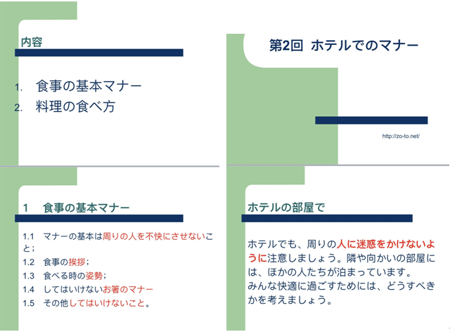 ・通过日本礼仪的课程学习,我们了解日本的衣食住行、社会文化,学习一门语言,不仅仅是会说会写,更应该学习如何融入这个国家的生活。感想这门课,让我们对日本有更深的了解,也提高了我们学习日语的兴趣。