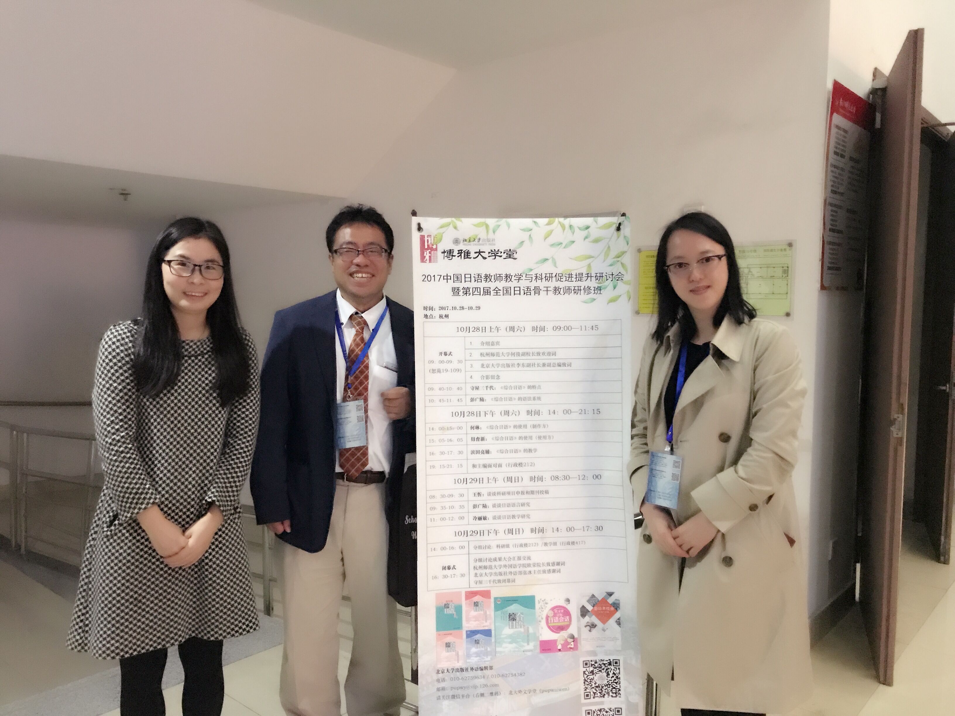 2017年10月28—29日,2017中国日语教师教学与科研促进提升研讨会暨第四届全国日语骨干教师研修班在杭州师范大学召开,我院日语系外教滨田亮辅、日语系教师金稀玉、陶魏青应邀参会。本次大会由杭州师范大学和北京大学出版社联合主办,来自国内外近100所高校和研究机构的140余名代表参加了本次大会。