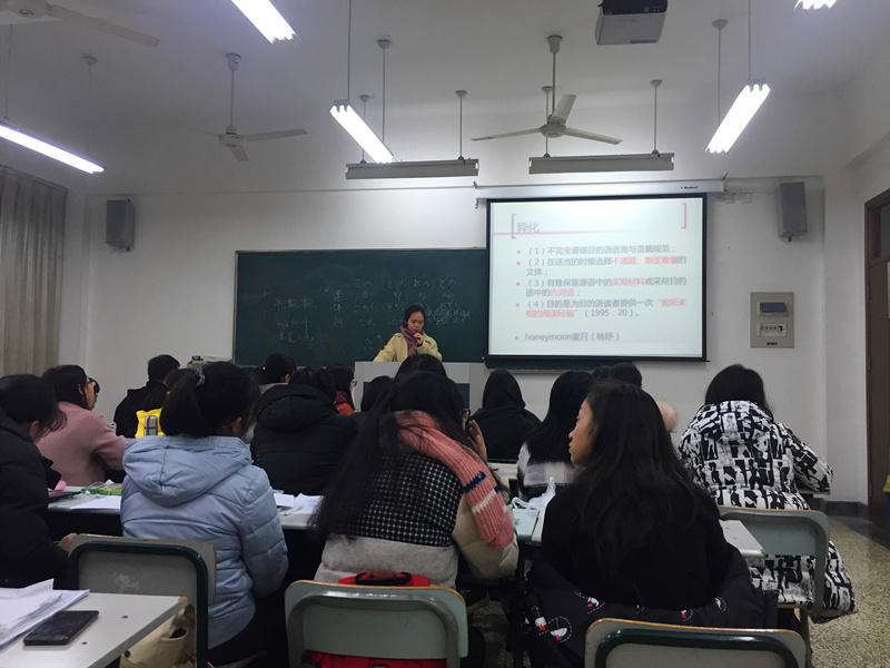 2017年12月14日-15日,翻译专业连续开展两场主题形式各异的教研活动。14日下午,翻译系教师齐聚在一楼连廊会议室,倾听由章莉老师带来的题为“以‘思辨创新’为核心的多元互动英语演讲教学”的校级课题改革汇报。她首先介绍了当下英语专业学生“核心素养”及“思辨能力”的改革背景,并从“硬件”和“软件”两个方面分别介绍了该教改获得的实践成果和学术成果。值得一提的是,章莉老师在此教改的基础上,成功申请了校级在线课程的建设,并准备申请省级在线课程建设,得到了在场教师的一致认可。随后,教师们热烈讨论,并在“思辨教学”方面为英语演讲课堂提出了中肯的建议。