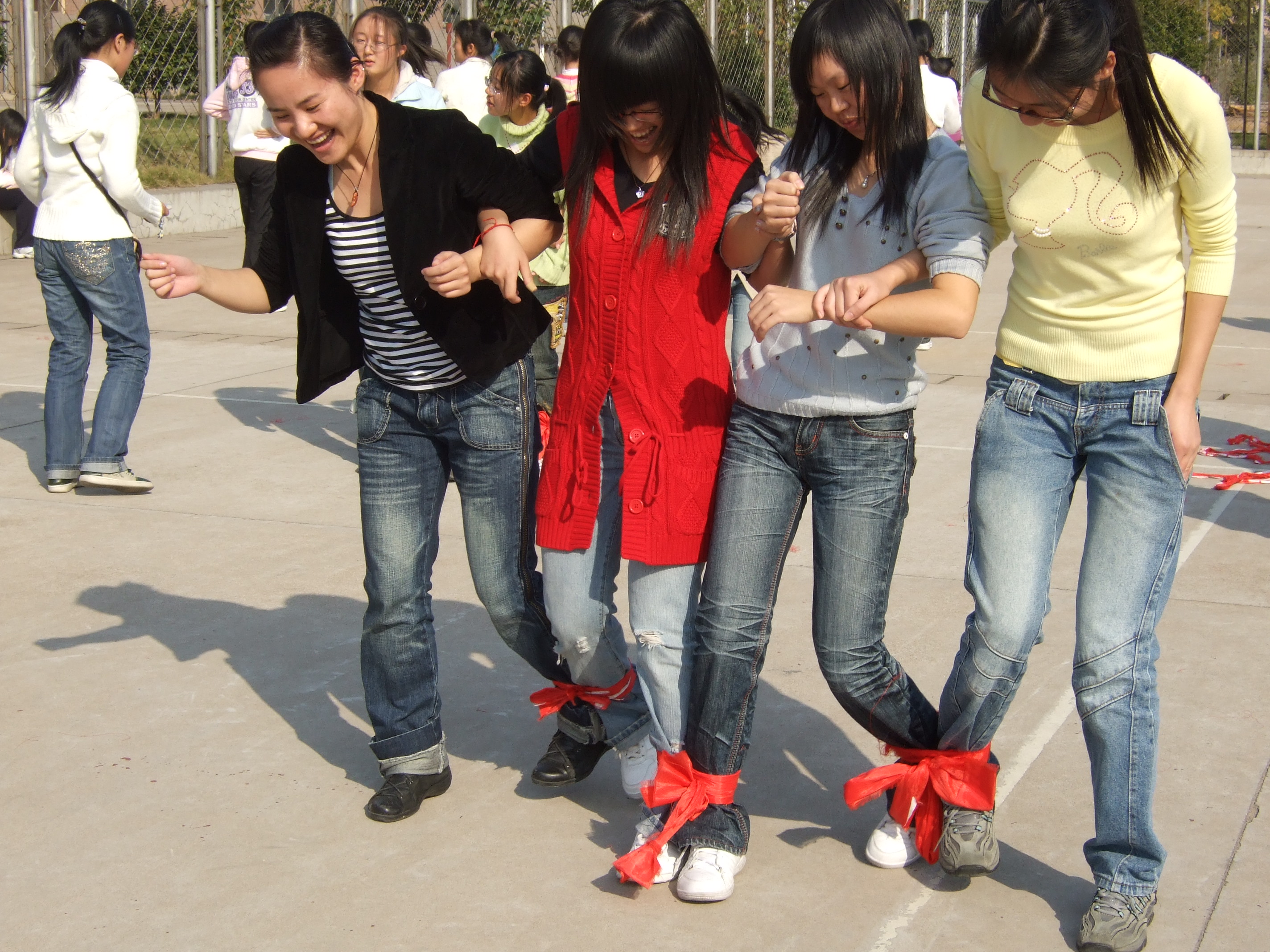 游戏中, 数四人五足最为考验寝室室友间的默契。四人并排两两用绳子将腿绑住赛跑,中途不能分开,赛程约
