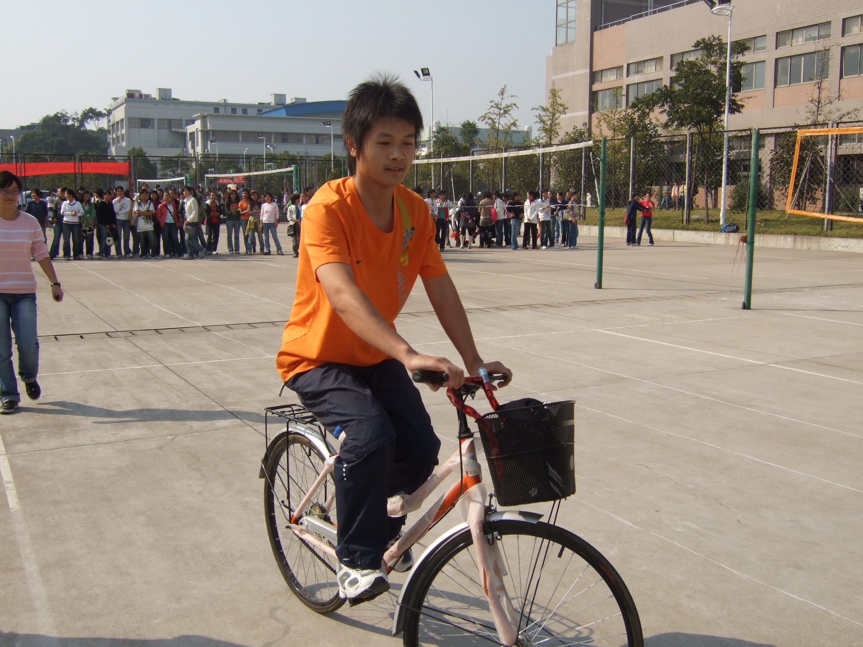 此活动又名“慢骑车”。每各寝室选派一名代表参赛,同学们左歪右扭,姿势各异,为的只是想让自己的自行车骑得慢点,再慢点。在采访中,大家普遍反映这个活动最具挑战力。一位英语班的同学说到:“这真是太痛苦了!车头一个劲地晃荡,只好用脚踩一下地。”不过,从她那灿烂的脸上我们不难读出其快乐之情。每次一场比赛结束后,室友们都会聚在一起说笑自己的感受。同时,也会有未比过的同学上前讨教经验,整个场地上加油声、笑声不断。