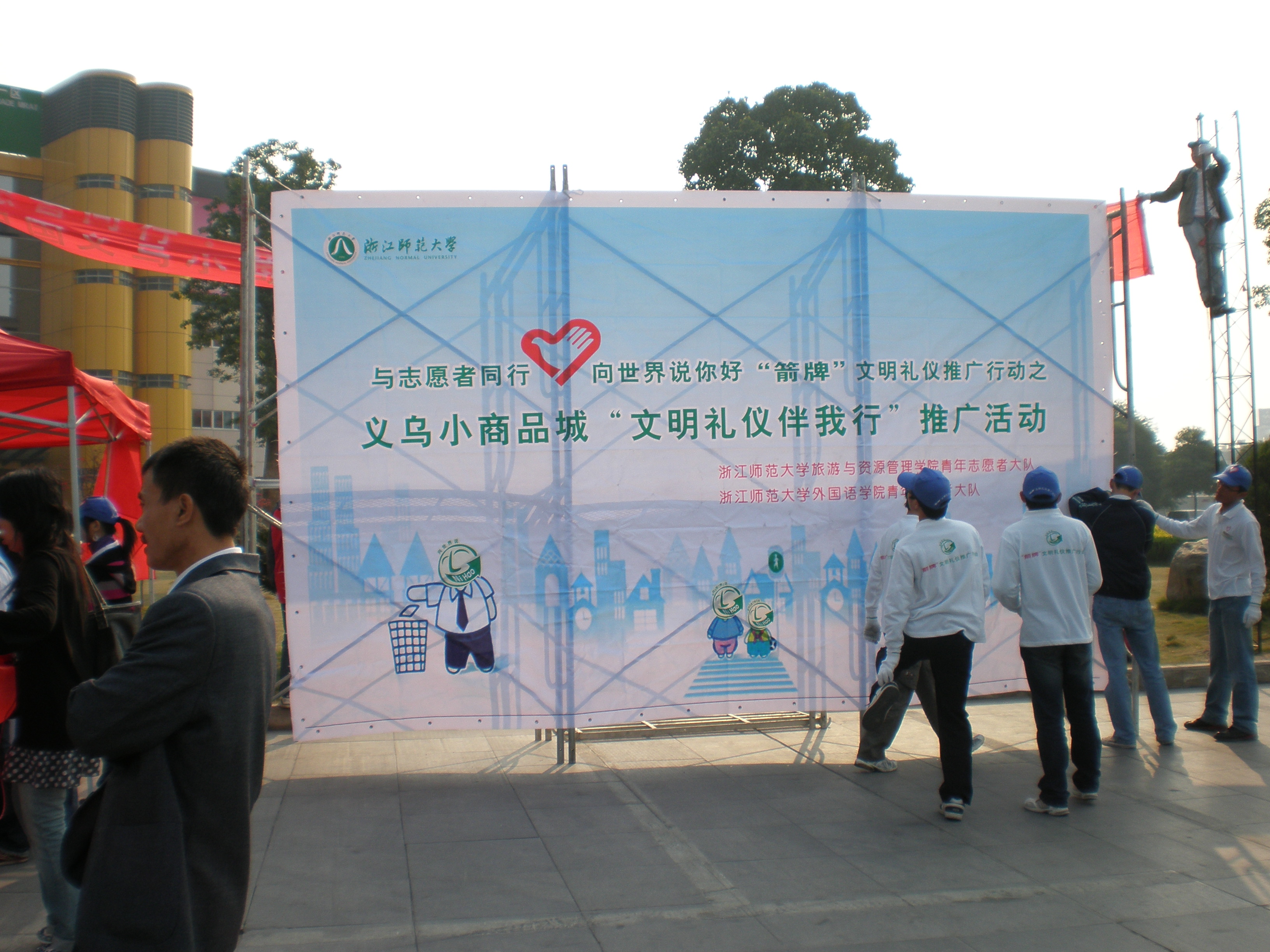当日,30名志愿者在义乌小商品城大型露天广场开展活动,主要形式有发放并回收调查问卷,发放《文明礼仪宣传手册》,展览以“弘扬文明礼仪,构建文明市场”为主题的宣传画报等。此次活动受到义乌人民以及外商的好评。