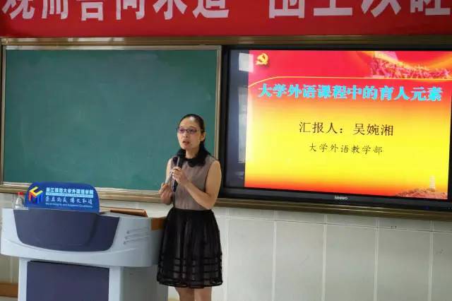 大外部教工党支部吴婉湘老师以“中国梦”“感恩之心”“自强不息”“大学之道”为关键词,讲述大学外语课程中的思政元素。通过比较中国梦和美国梦、感恩节写感恩信,以及海伦·凯勒、张海迪等名人励志故事,努力引领学生成为“具有家国情怀、国际视野、责任担当” 的优秀人才。