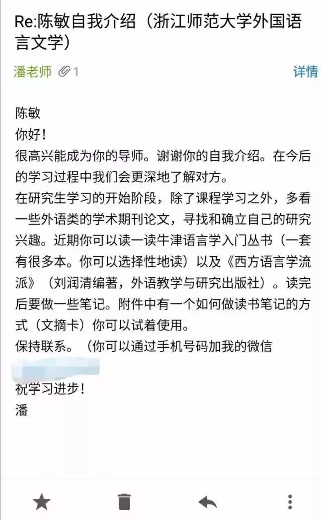 与班里其他同学不同,我的导师是校外的老师,这也意味着我与导师面对面的交流机会会少很多。还记得第一次见导师是去年的12月,潘老师作为答辩专家来到了师大。虽然之前就读于浙工商的同门跟我描述过,老师非常温柔、有耐心,但我还是不免有些紧张。然而在见到老师的那一刻,所有的紧张都消失了。潘老师给我的第一印象是气质非凡,很温柔。印象最深刻的是老师在见到我的时候跟我握手,并非常正式地做了自我介绍,这让我受宠若惊。之后,老师对我们的研究兴趣做了了解,并给出了许多建议。比如在研一时期要多接触语言学各个分支,有所了解,在找到自己感兴趣的方面时则要缩小范围,深究一二。虽然老师由于工作原因当天要赶回杭州,见面时间只持续了一个小时,但几天后,我就收到了潘老师发来的书单以及关于语言学学习的一些建议。