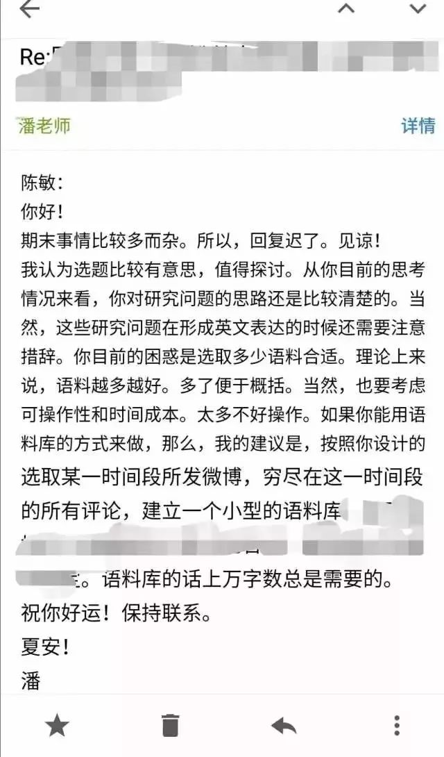 潘老师是一位非常负责任的老师。潘老师经常会问我最近在做什么,学习中有没有什么问题或者想法。说到这我感到很惭愧,因为作为学生其实应该是由我去主动联系老师。记得上个学期时,有一次给潘老师发邮件说明了有关论文的一些想法,那天老师虽然身体不适,但还是很快就回复了我,并非常详细地告诉我写论文中要注意的一些事项,这让我很感动。