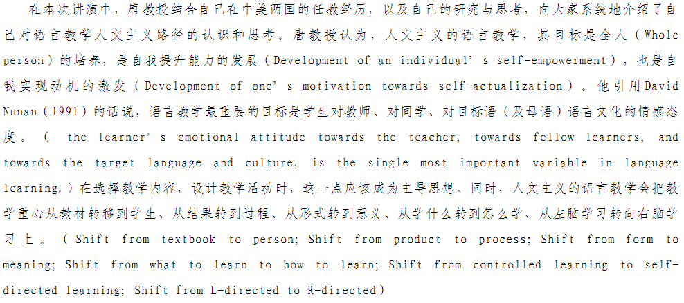 唐教授的讲演既有理论观点的旁征博引,又有亲身经历的真实案例,让在场师生深刻体会到人文主义语言教学思想的魅力。