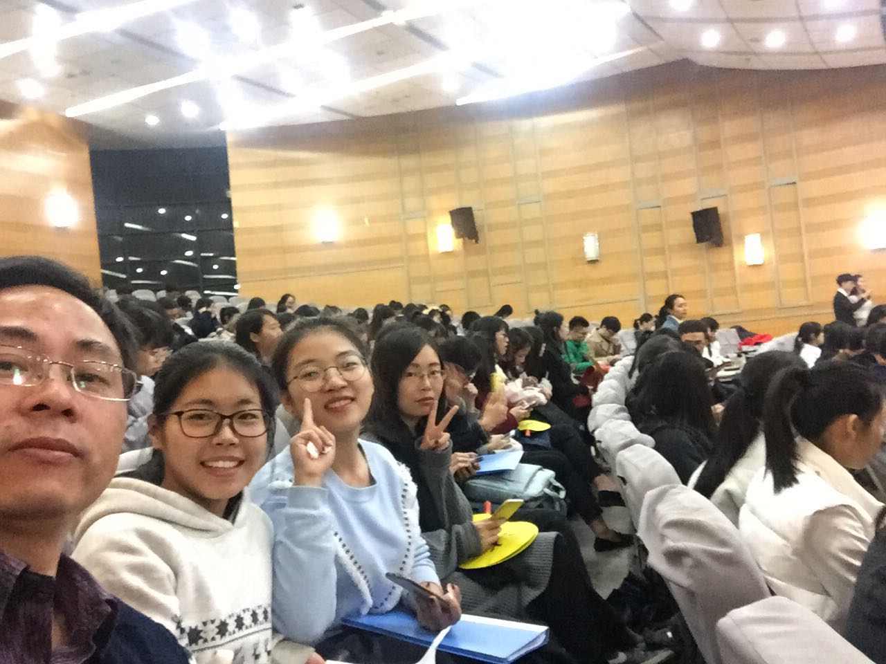 那是一个周六,原本可以在家里看着电视好好休息的一天。没有丝毫的准备,我们抱着试一试的想法问老颜:我们班有一个主题班会的决赛,你可以来看我们一下吗?没有一丝犹豫,老颜满口便答应了下来。六点半开始的节目,老颜六点便等在了报告厅。本是和第一排评委老师一样的身份,他却和我们坐在观众席里面。玩着自拍,随时地闲聊。瞧老颜那傲娇的小表情,每次看到都忍不住大笑。但是,老颜,我偷偷告诉你,你的自拍技术真的很差好嘛。上台发言也是和我们一样很紧张,说不出话来。但这并不影响我们爱你呀!