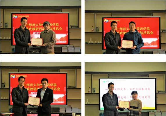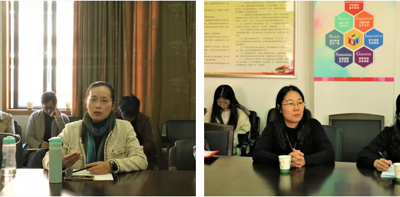 两位老师分享了授课和听课后的感悟,翻译系章莉老师谈到,选择和讲到“改革开放四十周年”这个话题并非刻意,而是惊鸿一瞥,有所触动,便以此融入自己的课堂教学内容,以期培育学生正确的价值观、德育观和爱国情怀。英语系副主任竺金飞老师则解读了“思政”二字,她认为“政”字是指立德树人,因此在老师给予学生引导和反馈时要向学生弘扬正能量。