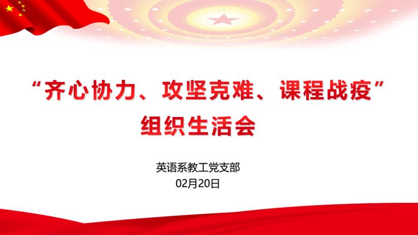 在全国上下齐心协力抗击新型冠状病毒肺炎疫情的特殊时刻,英语系教工党支部于2月20日召开了“齐心协力、攻坚克难、课程战疫”为主题的线上组织生活会。会议由支部书记俞燕明主持,英语系教工党支部全体成员及英语系骨干教师参加了本次会议。