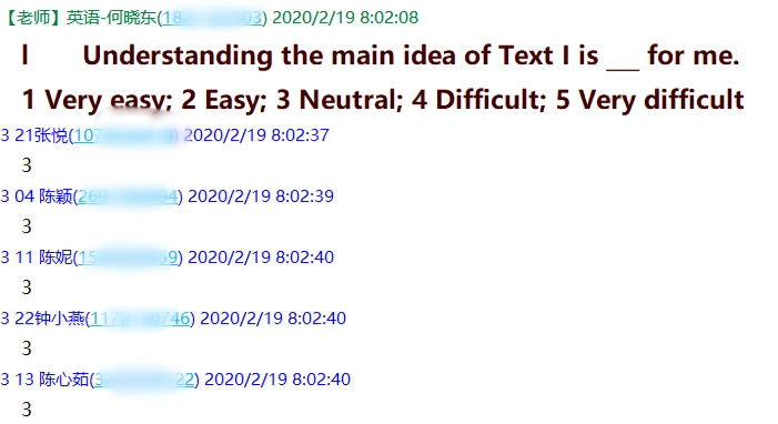 何晓东老师每次课前给出具体的问题、任务,要求学生做好预习准备;学生作业上传浙师云盘,教师课上反馈或组织讨论。根据简便实用的原则,同时为确保所有学生的网络流畅,他选择了QQ群语音+发送文字或图片的授课方式。课前将所有需用到的提问、截图、学生分组设置等等罗列好,以节省上课时间。上课过程中注重互动。师生互动有全体学生利用文字提问、发送答案,利用语音学生自主发言或教师点名发言。另新教学形态下的生生互动不打折扣,有利用微信语音做pair work或者group work。为提高学生课堂专注力,上课结束前请学生上传课堂笔记电子稿或手写稿供分享。