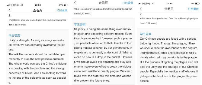 当被问及我们可以从疫情中学到什么时,同学们的回答展现了大家对政府的信心及对医护人员的敬意。