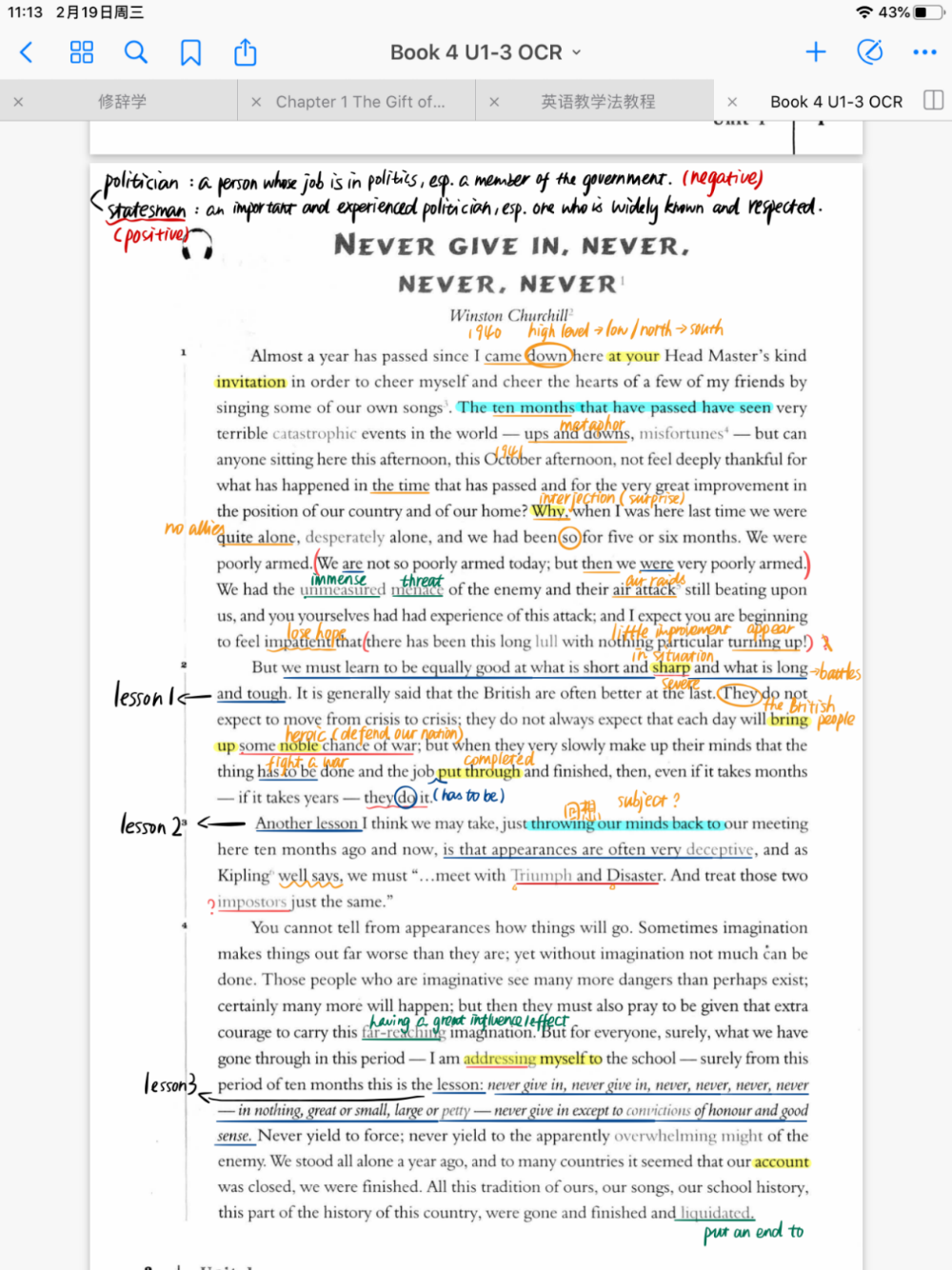 罗美娜老师开学初给学生的留言中就写到:“亲爱的同学们,新学期好!当前,我们和我们的祖国正经受着巨大的考验。尽管如此,正如我们第一课将要学到的丘吉尔所说,‘Never give in, never, never, never ... we have been allowed, each of us according to our stations, to play a part in making these days memorable in the history of our race.’(绝不屈服,绝不,绝不,绝不...... 我们每个人都被允许按照自己的身份地位发挥作用,使这些日子成为我们民族历史上值得纪念的日子。)’当前我们宅在家中,努力学习,就是我们对祖国做出的最好贡献。相信我们很快能打赢这场战役。待到春暖花开,我们又能相聚在师大美丽的校园中。”她课堂上充分挖掘课程第一课--前英国首相丘吉尔的演讲名篇的意义和内涵,通过援引丘吉尔的名言和学生进行交流,号召同学们通过居家努力学习为我们的伟大祖国贡献我们自己的力量;鼓励大家Never give in, never, never, never(绝不屈服,绝不,绝不,绝不),一起战“疫”。