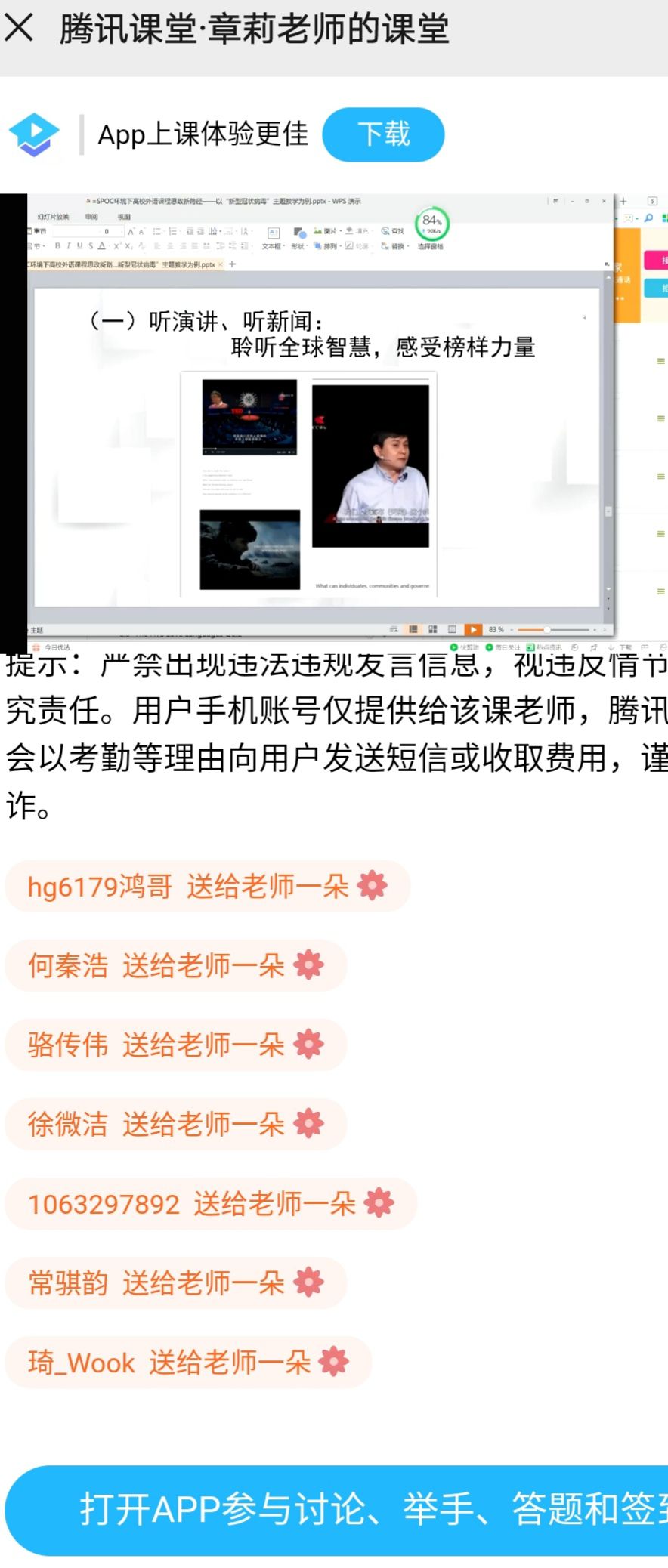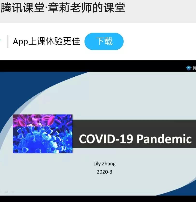 上午8:00至9:30,章莉老师结合课程思政理念和当前疫情背景,首先对课程进行了介绍和导入;接着,她以新型冠状病毒防疫为主题,进行线上公开课展示。课堂材料选取紧扣时政,师生互动方式多样,学生及观摩教师纷纷在线献花点赞。