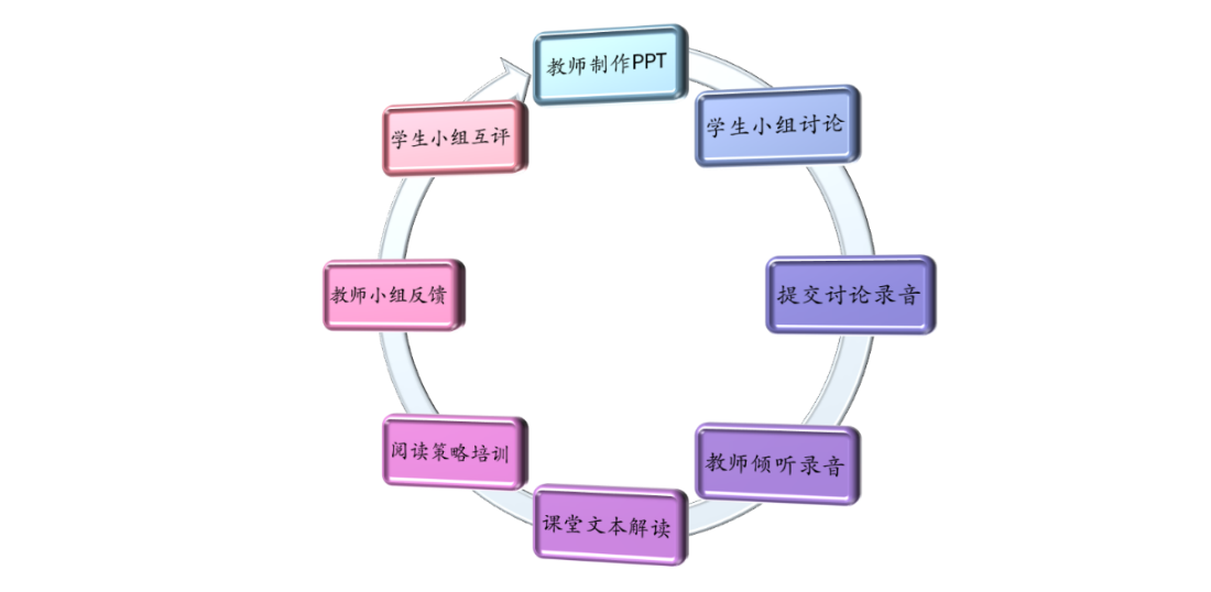 兰老师接着介绍了单元授课流程。先由教师在解读文本的基础上制作PPT,然后发给学生进行线上全英文小组讨论(每次1小时),接着提交讨论录音,教师在倾听学生讨论录音之后,在课堂中展示文本解读的过程,有针对性地进行阅读策略培训。教师不仅针对小组录音给出口头录音反馈,而且逐步培养学生进行小组互评等。他在教学过程中注重问题设计,问题针对有关复句理解、文章结构分析、主题理解、人物解读、叙事风格等,还鼓励学生讲述个人故事,进行文本批判解读以及围绕主题进行辩论问题,并将问题设计和批判性思维、创新性思维关联起来。