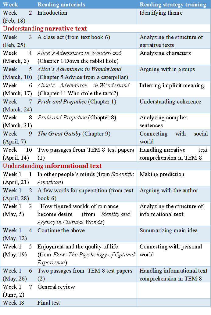 接着,制定教学计划中,他根据文体类型先设定范围,然后学生通过投票表决的方式选出比较有挑战性的、有助于发展学生阅读思维的阅读材料。这样的学生需求调查不仅体现了阅读教学的一个整体规划,而且充分尊重学生的阅读需求。他将文本分为叙事类和信息类,叙事类包括Alice’s Adventure in Wonderland, Pride and Prejudice, The Great Gatsby等英文原著经典章节,信息类包括一些心理学经典作品如Flow: the Psychology of Optimal Experience、心理人类学经典如Identity and Agency in Cultural Worlds,还包括Scientific American 等相关文章。此外,阅读素材还涵盖了教材中的两篇文章和专业八级考试中的阅读理解。