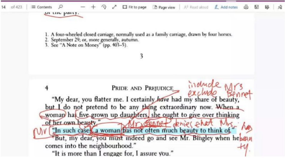 兰老师以英文原著Pride and Prejudice第一章为教学素材,按照整个课程的具体规划,对学生小组讨论的录音进行了分析和评价。第一阶段,他播放录音,指出学生讨论中引发出来的饶有兴味的解读点,邀请学生参与互动,带领学生通过理解作品中的衔接手段来把握作者如何利用人物对话来塑造人物形象。由于对a woman指称内容的不同理解可以带来不同的语用推理,由此带来对Mr. & Mrs. Bennet夫妇人物性格的理解,以及他们之间的交际失误,兰老师以此为基础批判评价作品所处时代的社会大环境,指出婚姻要基于彼此的相互沟通理解,而不仅仅是基于财富。兰老师还利用一个学生讲述的故事来分析如何讲述一个好的故事,以及叙述时候参与者如何进行评价,并引导他们树立正确的婚姻观。兰老师真正做到了以学生为中心,循循善诱,层层深入,给参与此次观摩活动的教师留下了深刻的印象。