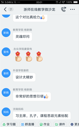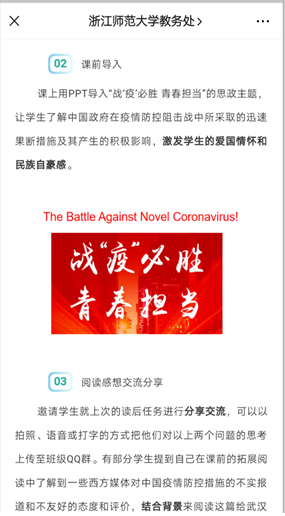 [教学效果]通过本次课程思政的教学实践,培养了学生的民族自豪感、爱国主义情怀和人类命运共同体意识;增强了他们的自我防护意识、责任意识和使命担当,坚定了战“疫”必胜的信心。本案例参加了学校教务处组织的“在线教与学的探索与体会”征文活动,获“战疫”课程思政优秀案例,在学校教务处公众号上进行了报道,并在教务处教师发展中心组织的浙师在线教学微沙龙第三期-“课程思政”钉钉群研讨会上做了直播交流,与参加本次活动的523位教师和学生分享了自己的教学感悟,受到了广泛的好评,产生了积极的社会反响。