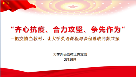 大学外语教工党支部在疫情中,利用“互联网+教学”形式,积极开展线上教研,科学谋划,增强线上教学能力,努力打造线上“金课”。将德育与智育相结合,以课程思政为抓手,创新育人手段,把防疫过程中的典型经验与感人事迹变成教育教学中的“活教材”,把疫情防控阻击战作为一次生动的思想政治课,实现显性教育与隐性教育的结合,赋予《大学英语》课程时代的广度与厚度,培养学生的爱国情怀和社会责任担当意识,培养学生科学认识和理性参与公共危机事件治理的能力。
