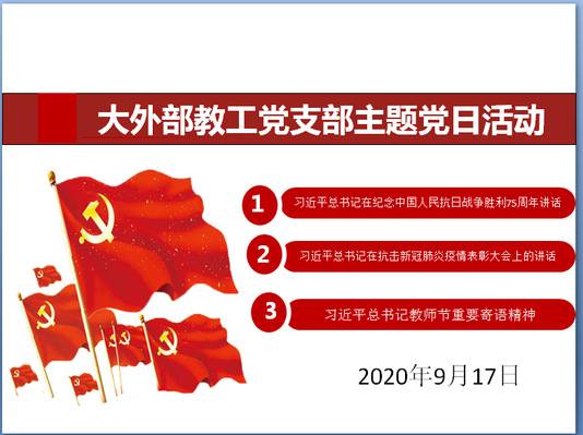 9月17日上午,我院大外部教工党支部在一楼连廊会议室开展主题党日活动,围绕“习近平总书记在纪念中国人民抗日战争胜利75周年讲话”“习近平总书记在抗击新冠肺炎疫情表彰大会上的讲话”“习近平总书记教师节重要寄语精神” 等多个主题进行讨论交流。
