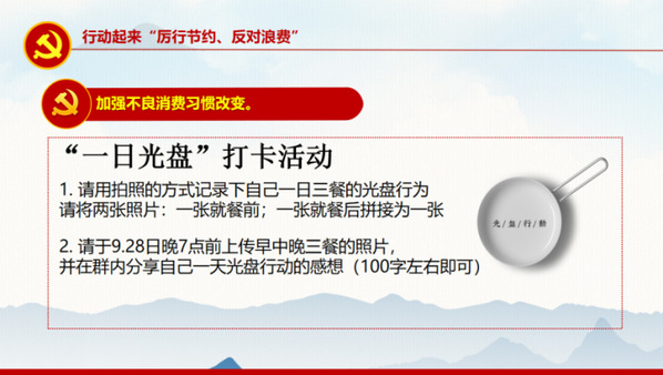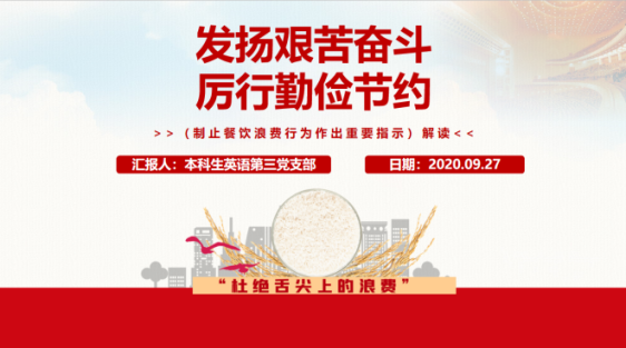 本科生英语第三党支部开展了以“发扬艰苦奋斗,厉行勤俭节约”为主题的党日活动。李鸿鑫同志就学校发现的餐饮浪费现象,从加强餐饮节约宣传教育、加强餐饮法规制度约束、加强餐饮消费督促检查等三方面分享了制止餐饮浪费的措施。支部全体成员积极参与“一日光盘”活动,并纷纷发表感想。曹也同志指出,勤俭节约一直是中华民族的优良传统,也是党的优良作风,我们应当从身边做起,从每日光盘做起,将优良传统不断传承,发扬光大。