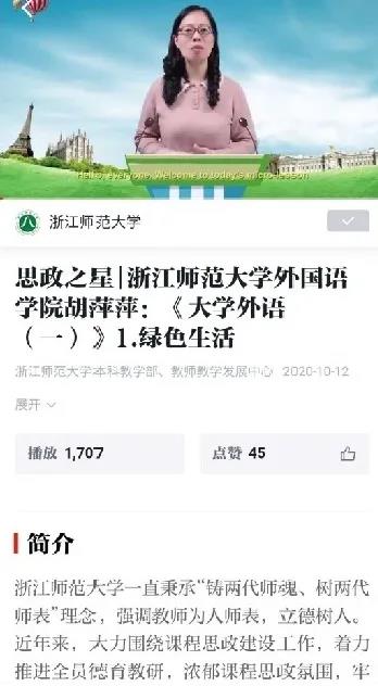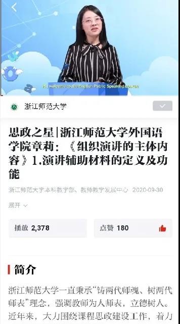 为真正落实立德树人的教育理念,浓郁课程思政氛围,构建全员全程全方位的育人大格局,浙师大组织开展了首届“课程思政”微课比赛评选,从106门申报课程中精选47门优秀课程,并授予获得一等奖课程的12位教师为校首届课程“思政之星”荣誉称号,我院章莉、胡萍萍两位老师获此殊荣,其课程于近日登上“学习强国”平台。