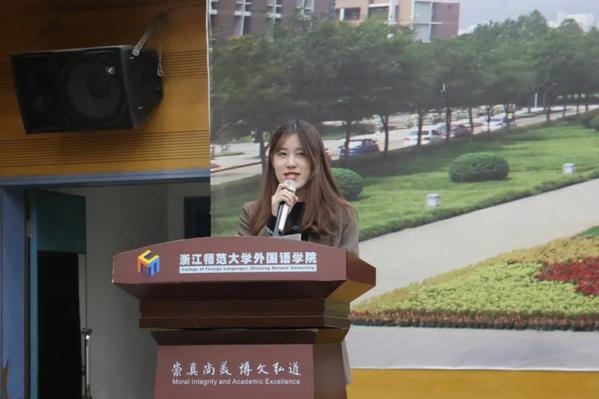 本科生英语第三党支部的钱诗涵以五卅运动这一历史事件为引讲述四史学习之道,提出新时代青年要学好历史知识,汲取历史经验;把握历史大势,形成正确历史认知;传承历史精神,坚守历史使命。学习“四史”,不能仅仅停留于理论层面,最终要落实到实践中去。钱诗涵以外院学子暑期实践的故事为例讲道,“我们以金华历史为切入点学习‘四史’,无论是在义乌分水塘村的茅草屋里翻译《共产党宣言》的陈望道,还是努力打造‘东方好莱坞’金名片的横店,抑或是运用‘下山脱贫’模式的武义县城,都在为社会发展贡献力量。”