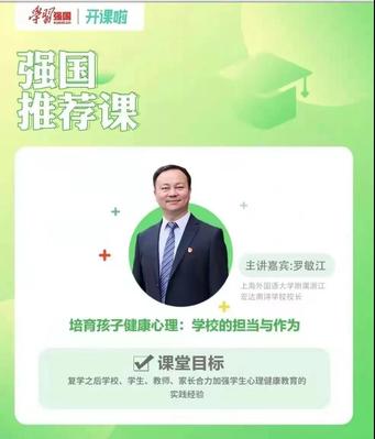 近日,“学习强国”平台推出“开课啦”系列课程,首讲邀请了我院英语教育94届校友,浙江省特级教师,上海外国语大学附属浙江宏达南浔学校校长罗敏江带来《培育孩子健康心理:学校的担当与作为》课程。该课程旨在分享复学之后学校、学生、教师、家长合力加强学生心理健康教育的实践经验,探讨相应对策。