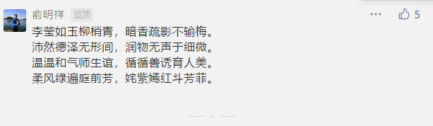 每逢假期,李沛老师总是时刻牵挂每一位同学的安全状况,从前期提醒大家买票,到后来询问大家回家方式,再到最后,询问每个同学是否安全回家,李老师的爱一直包围着我们。疫情期间,她更是关心每一位同学的安全,询问居家情况,关心我们的心理健康。李沛老师用最柔和的爱裹挟着我们每一个人向更好的自己前进。爱的含义不只是奉献自我,还是给他人最好的寓所,让他人在最幽美的心田居住。李老师便是如此,用诚心耐心打开了学生的内心,用柔心关心保护着每一个人。