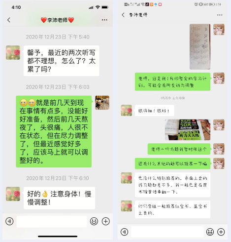 李沛老师对我们的关爱从来是都是如水般温柔舒适的。她会通过观察学生们课上的学习状态,提交的听写、作业情况等等来观察学生的心理状态。当遇到对未来比较迷茫的学生,李沛老师就会通过各种各样的途径去询问他的状况,并根据自己的经验去开导他们。“大家现在毕竟还年轻,也正处于知识积累的时期,这个时期遇到的迷茫、挫折都是暂时的。这个阶段的大家是具有很多可能性的,只要坚持下去,或者暂时把它放在一边,尝试另一条路,还是会有新的发现和更好的机会。我们要理解丰富的可能性和变化性,这样可能就会豁然开朗。”李沛老师如是说道。细雨般温和的关怀无时无刻不在滋润着同学们。