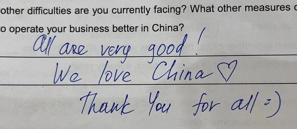 发放问卷时,队员们还遇到了一位来自俄罗斯的商人,她用一口流利的中文和我们进行了沟通。问卷上的那句All are very good! We love China. Thank you for all.,以及文字结尾的爱心符号和临走前中文 “加油”都深深触动了每一位队员。国际视野下,他们都来自不同的国家,穿梭于偌大的商贸城中,却共同绘制着义乌繁荣的市井商贸图。